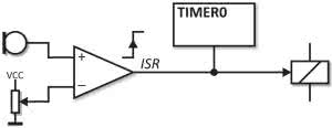 Zadziałanie komparatora generuje przerwanie systemowe, a w podprogramie obsługi sprawdzany jest stan licznika układu czasowo-licznikowego Timer0. Licznik jest taktowany przebiegiem zegarowym o częstotliwości 125 Hz pozyskanym z podzielenia częstotliwości taktującej mikrokontroler przez podzielnik równy 1024. Dzięki takiemu rozwiązaniu każde zdarzenie – klaśnięcie, powoduje przechwycenie stanu licznika układu czasowo-licznikowego Timer0. To pozwala określić odstęp pomiędzy kolejnymi tego typu zdarzeniami, i w efekcie selektywne sterowanie przekaźnikiem wyjściowym REL (wyjście PB3 mikrokontrolera).