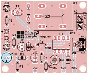 Zaprojektowano niewielką, dwustronną płytkę drukowaną z zastosowaniem wyłącznie elementów przewlekanych montowanych po stronie TOP. Montaż urządzenia rozpoczynamy od przylutowania wszystkich rezystorów i diody D1. Następnie lutujemy kondensatory, później wszystkie elementy półprzewodnikowe (w tym diody LED CLAP i OUT), a na samym końcu mikrofon elektretowy MIC (zachowując odpowiednią polaryzację elementu), potencjometr montażowy POT, przekaźnik sterujący K1 oraz złącze przyłączeniowe AC.