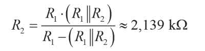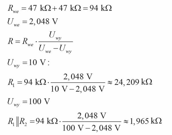 Wartości rezystorów dzielnika zostały obliczone z poniższego wzoru. Dla uproszczenia zapisu wzorów przyjęto wspomniane wcześniej nazwy alternatywne. Na zakresie do 10 V działa tylko rezystor R1, zaś do 100 V równoległe połączenie R1 i R2. Należy pamiętać, że napięcie wyjściowe Uwy powinno wynosić 2,048 V przy maksymalnym napięciu wejściowym Uwe dla danego zakresu. Dla rezystorów R5 i R6 przyjęto wartości 47 kΩ, a do nich dobrano pozostałe:
