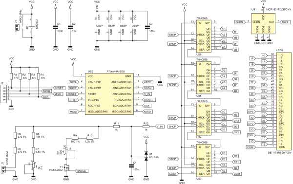 Schemat ideowy energooszczędnego woltomierza został pokazany na rysunku 1. Źródłem zasilania dla tego układu może być bateria typu CR2032, której gniazdo znajduje się na płytce, albo zewnętrzny zasilacz napięcia stałego o wartości 3 V, podłączany do zacisków złącza J1. Tętnienia napięcia, spowodowane niezerową rezystancją wewnętrzną wyżej wymienionych źródeł zasilających układ, redukują kondensatory C1…C3.