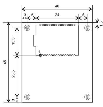 Układ został zmontowany na niewielkiej, dwustronnej płytce drukowanej o wymiarach 45×40 mm. Jej wzór ścieżek oraz schemat montażowy został pokazany na rysunku 6. W odległości 3 mm od krawędzi płytki znalazły się otwory montażowe, każdy o średnicy 3,2 mm. Szczegóły dotyczące wymiarów płytki oraz lokalizacji otworów i wyświetlacza pokazuje rysunek 7.