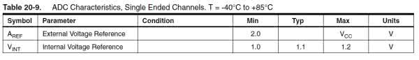 Można zastosować źródło zewnętrzne, podłączone do wejścia ADC0, ale musi być spełniony jeden warunek. Otóż wbudowane źródło napięcia odniesienia ma wartość około 1,1 V, natomiast zewnętrzne musi mieć nie mniej niż 2 V (rysunek 2). Powodów producent nie podaje, lecz można sądzić, że chodzi o zapewnienie poprawnej pracy np. wtórnika napięciowego. Układ typu MCP1501T-20E/CHY idealnie nadaje się do tego zastosowania, ponieważ jego napięcie wyjściowe wynosi 2,048 V, co spełnia wymagania stawiane przez ATtiny44A. Tolerancja wartości to zaledwie ±0,1%, co jest wynikiem rewelacyjnym w odniesieniu do niskiej ceny (ok. 3 zł netto).