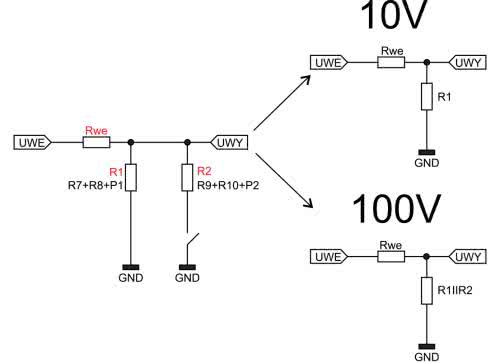 Mierzone napięcie jest dzielone przy użyciu dzielnika rezystancyjnego. Jego uproszczony schemat został pokazany na rysunku 4. Rozszerzenie zakresu pomiarowego następuje poprzez dołączenie drugiego rezystora (R9+R10+P2) równolegle do włączonego na stałe „dolnego” rezystora dzielnika (R7+R8+P1). Rysunek ten zawiera również alternatywne nazwy tych elementów, w kolorze czerwonym, co zostanie wyjaśnione w dalszej części artykułu.