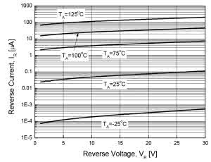 Podczas projektowania dzielnika napięciowego konieczne było uwzględnienie prądu płynącego przez zaporowo spolaryzowane diody znajdujące się w strukturze BAT54S. Może to mieć znaczenie, ponieważ są to diody ze złączem Schottky’ego (rysunek 5). Wartość napięcia polaryzującego zaporowo nie będzie wysoka (nie więcej niż 3 V dla jednej z diod), za to możliwy jest szeroki rozrzut temperatur, co przełoży się na szeroki zakres wartości prądu wstecznego – od około 70 pA przy –25°C do nawet 2 µA przy 75°C. Dlatego rezystancja obwodu polaryzującego diody nie może być bardzo wysoka, ponieważ ten dodatkowy prąd mógłby zakłócać pomiar. Nie ma też gwarancji, że przez obie diody będzie płynął prąd o dokładnie takim samym natężeniu, co rozwiązywałoby problem.