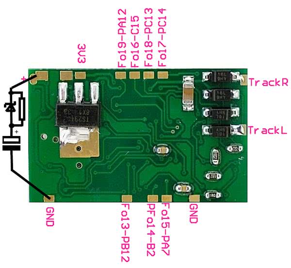 Ze względu na znaczny pobór prądu przez układ dźwiękowy, praca dekodera bez układu podtrzymania zasilania nie ma większego sensu. Kondensator UPS można podłączyć tak, jak to zostało naszkicowane na rysunku 8.