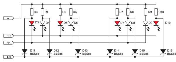 Dekoder umożliwia dla jazdy manewrowej włączenie obu (FR i FH) wyjść sterujących światłami (konfiguracja w CV24). Powoduje to niestety świecenie zarówno białych jak i czerwonych świateł jeśli lokomotywa jest w nie wyposażona. Ponadto świecą oba czołowe, a powinno jedno. Dekoder ma możliwość wysterowania wyjścia w czasie jazdy manewrowej. Budując prosty układ z rysunku 10, składający się z kilku diod, można zapewnić oświetlenie po części zgodne z instrukcją PKP E1.