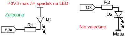 Podstawową zaletą takiego połączenia jest uzyskanie na wyjściu wyższego napięcia, co ma znaczenie dla białych i niebieskich diod LED. Dodatkowo, dioda nie pobiera prądu z kondensatora UPS. Trzeba pamiętać o ograniczeniu prądu pobieranego z wyjścia cyfrowego do 25 mA na jedno wyjście i 80 mA dla wszystkich wyjść razem.