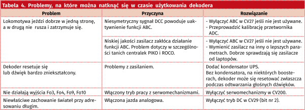Duże możliwości dekodera są okupione dużą liczbą rejestrów konfiguracyjnych (tabela 2) ale przeważnie wystarczy skonfigurować kilka z nich aby uzyskać pożądane efekty. Dostępnych jest pięć zestawów dźwięków (tabela 3), które pozwalają na uzyskanie dźwięków jedenastu różnych lokomotyw. Obecna wersja programu ma na stałe przypisane adresy lokomotyw.
