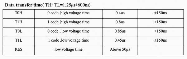 Diody sterowane są impulsami o okresie 1,25 µs ±600 ns (rysunek 6), co daje przepływność na poziomie 800 kb/s.