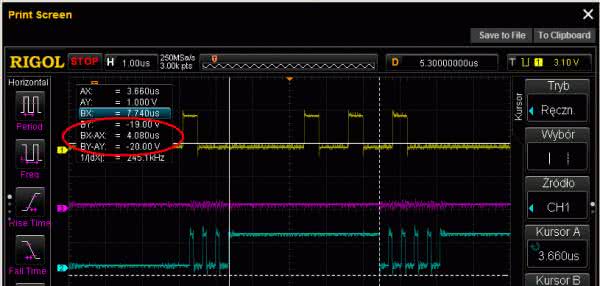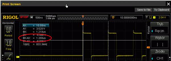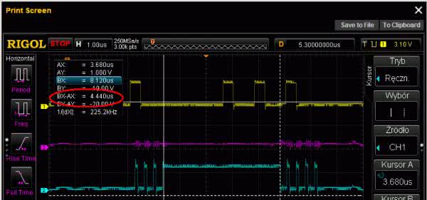 Wynik działania programu obsługi przerwania został pokazany na rysunku 9. Czas obsługi przerwania wynosi 4,44 µs więc na pewno nie będzie zinterpretowany przez diody jako reset. Po optymalizacji kodu, której wynik pokazano na listingu 2 (niepotrzebne operacje zakomentowano) czas przerwania zmniejszył się do 4,08 µs. Łączna oszczędność 7 rozkazów/cykli ma dość duże znaczenie z racji bardzo częstego wywoływania przerwania.