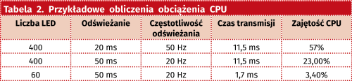 Jak łatwo zauważyć pomiędzy przerwaniami program główny wykonuje około 16 rozkazów. Dość mało i niewiele da się zrobić w takim czasie. Jeśli jednak weźmiemy pod uwagę to, że transmisja nie musi trwać bez przerwy i pomiędzy paczkami wstawimy pauzę o długości 20 ms, co da odświeżanie zawartości LED na poziomie 50 Hz, to przy 60 diodach LED otrzymamy: 60·1,2 µs·24 bity ok. 1,7 ms, czyli zajętość CPU na poziomie 8,5%. Przykładowe obliczenia obciążenia CPU dla innych parametrów pokazano w tabeli 2.