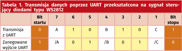 Zatem przepływność UART powinna wynosić 2,4 Mb/s (1,6...4,6 Mb). Ramka transmisyjna UART 7N1 składa się z dziewięciu odcinków czasowych – bit startu, 7 bitów danych i 1 bit stopu. W jednym bajcie można przesłać 3 bity sterujące diodą typu WS2812. Bit startu i stopu ma z góry ustaloną wartość. Niestety bit startu to zero, a bit stopu jeden. Po zanegowaniu sygnału UART otrzymujemy sygnał wymagany przez sterownik diod LED typu WS2812. Aby wysłać trzy bity o wartości 0 poprzez UART należy wpisać wartość $26 (binarnie 100110). Działanie tego rozwiązania zostało zobrazowane przy pomocy tabeli 1.
