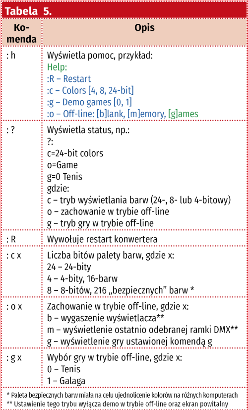 Komendy są interpretowane gdy nie trwa transmisja DMX po RS485/422 lub USB. Transmisja jest sygnalizowana cykliczną zmianą stanu sygnału CD (Carier Detect) w terminalu. Komendy można wydawać z terminala przez USB (wirtualny port COM dla FT221). Parametry transmisji (prędkość, format ramki) nie są istotne. Komendę rozpoczyna znak „:” kończy CR lub CR+LF. Każda komenda jest potwierdzana komunikatem na ekranie (najczęściej wyświetlenie wprowadzonych parametrów). W tabeli 5 znajduje się spis komend (komendy wprowadzamy bez spacji, dodane je dla lepszej czytelności).