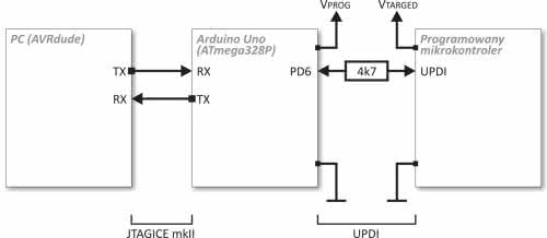 Oprócz oprogramowania niezbędnego po stronie PC (AVRdude) niezbędny jest prosty układ, który protokół JTAGICE mkII stosowany po stronie PC transkoduje do nowego protokołu interfejsu UPDI. Autor oprogramowania postanowił wykonać konstrukcję na bazie popularnej płytki Arduino Uno/Nano i mikrokontrolera ATmega328P, jednak dla osób chcących poeksperymentować z innymi typami układów, przy udziale których można skonstruować wspomniany programator, autor udostępnił, także całe oprogramowanie źródłowe w postaci repozytorium serwisu GitHub.