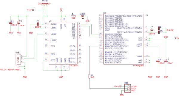 Wspomniany wcześniej rezystor R2 pełni w naszym układzie jeszcze jedną rolę, a mianowicie służy zabezpieczeniu programatora, gdyby w jednym czasie nastąpiła próba nadawania transmisji przez oba układy (nasz mikrokontroler ATmega88 oraz programowany układ z interfejsem UPDI). Już tylko dla porządku dodam, że wbudowana dioda LED VUSB służy do sygnalizacji napięcia interfejsu USB.