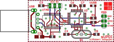 Schemat montażowy urządzenia sUPDI został pokazany na rysunku 3. Zaprojektowano bardzo zgrabną płytkę drukowaną ze zdecydowaną przewagą elementów SMD montowanych wyłącznie po stronie TOP obwodu drukowanego. Aplikację urządzenia rozpoczynamy od przylutowania układów scalonych. Proces ten najłatwiej wykonać przy użyciu stacji lutowniczej na gorące powietrze (Hot Air) i odpowiednich stopów lutowniczych.