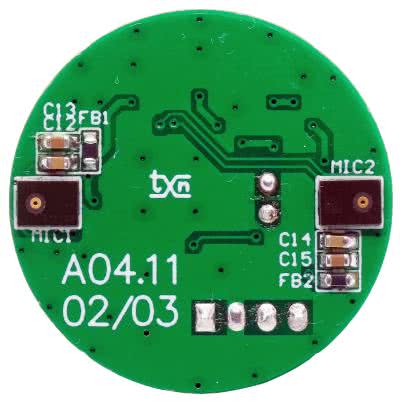 W module zastosowano cyfrowe mikrofony PDM typu MP34DT05 oraz procesor ADAU1772, znany Czytelnikom z projektu PicoDSP. Zastosowanie mikrofonów z cyfrowym interfejsem PDM umożliwia eliminację analogowych bloków wzmocnienia, znacząco upraszczając budowę układu.