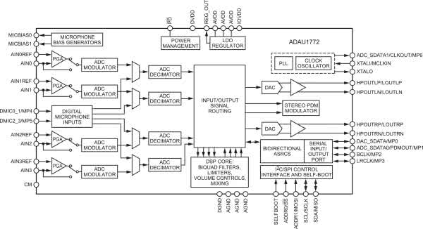 Układ ADAU1772 w swojej strukturze wewnętrznej, która została pokazana na rysunku 1, integruje nie tylko rdzeń DSP, ale także kodek audio z przedwzmacniaczami, bloki programowalnego wzmocnienia PGA oraz pomocnicze układy peryferyjne takie jak układ polaryzacji dla mikrofonów pojemnościowych, generatory transmisji szeregowej I2S/PDM umożliwiające realizację kompleksowego toru audio z obróbką DSP. Ze względu na przeznaczenie układu ADAU1772 do aplikacji mobilnych, cechuje się on niewielkim poborem mocy przy zachowaniu dużych możliwości kształtowania sygnału.