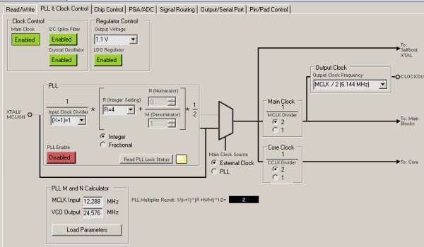 Częstotliwość oscylatora (External Clock) wynosi 12,288 MHz i taktuje procesor bezpośrednio z pominięciem bloku PLL. Dla poprawnej pracy interfejsu mikrofonów PDM, konieczne jest generowanie przebiegu zegarowego PDCK na wyprowadzeniu MP6 (CKO). Częstotliwość sygnału musi zawierać się w dopuszczalnym dla MP34DT05 przedziale 1,2...3,25 MHz, co można osiągnąć poprzez odpowiedni wybór podziału na wyjściu Output Clock. W wyniku podziału 12,288 MHz przez 2 (Main Clock) i 2 (Output Clock) daje spełniającą warunki częstotliwość 3,072 MHz (opis 6,144 MHz jest błędem w oprogramowaniu). Sygnał zegarowy dostępny jest wielofunkcyjnym wyprowadzeniu GPIO MP6, które należy skonfigurować do realizacji funkcji Clock Output zgodnie z rysunkiem 7.
