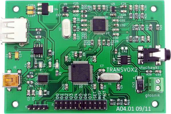 Na rysunku 2 został pokazany kompletny schemat ideowy automatu Transvox2. Na schemacie znajdziemy pominięte na rysunku 1: interfejs U2 pozwalający podłączyć procesor do portu USB komputera i układ U1 zabezpieczający przed nadmiernym obciążeniem prądowym w czasie podłączania zewnętrznej pamięci USB do gniazda J1. Gniazdo J2 służy do komunikacji z komputerem oraz do doprowadzenia zasilania +5 V.