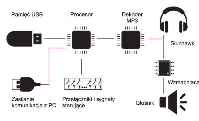 Na rysunku 1 zostały pokazane główne elementy Transvox2 i przepływy sygnałów pomiędzy nimi. Sygnał audio z dekodera MP3 jest podawany na gniazdo słuchawek i na wejście układu scalonego wzmacniacza, do którego podłączany jest głośnik. Procesor steruje pracą dekodera i przesyła w czasie odtwarzania dane z wybranego pliku. Pliki dźwiękowe do odtwarzania są zapisane w odrębnym katalogu na dołączanym zewnętrznym nośniku danych.