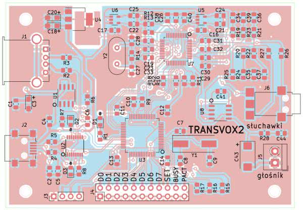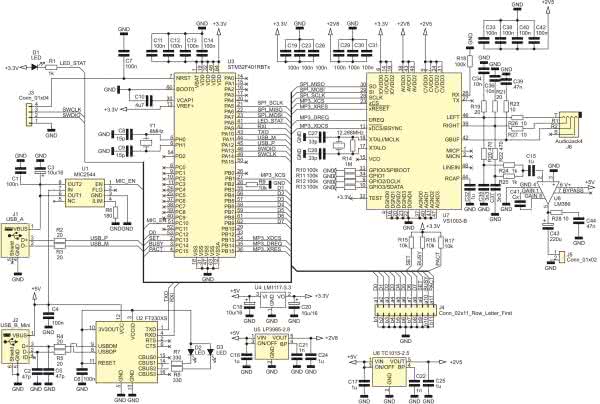 Jako dekoder plików dźwiękowych pracuje dobrze znany układ VS1003-B oznaczony na schemacie jako U7. Ponieważ w tym projekcie działa wyłącznie jako dekoder, kilka wyprowadzeń używanych podczas kodowania zewnętrznego źródła dźwięku pozostało niepodłączonych. Do wyjść dekodera można bezpośrednio podłączyć słuchawki poprzez gniazdo J6. Dla dołączenia głośnika potrzebny jest układ U8, który wzmacnia zsumowany sygnał audio kanałów lewego i prawego. Wzmocnienie układu U8 można zwiększyć dziesięciokrotnie przez wlutowanie w miejsce kondensatora C41 (U8 piny 1, 8) pojemności 10 µF. Bez kondensatora wzmocnienie wynosi 20 (26 dB). Dekoder jest sterowany poprzez magistralę SPI przez procesor U3.