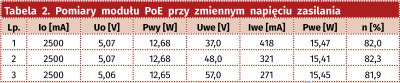Dla maksymalnego obciążenia 2,5 A sprawdzono, także zachowanie przy zmianach napięcia wejściowego, wyniki pokazuje tabela 2.