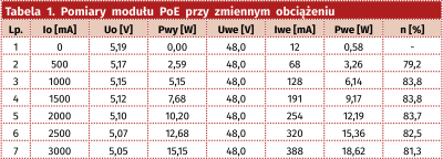 Przed podłączeniem modułu do RPi warto przeprowadzić próby działania. Do wejścia PoE należy doprowadzić napięcie 48 V (wyprowadzenia 1-2 PoE), wyjście V50 (wyprowadzenia 1, 3 GPIO) podłączyć do sztucznego obciążenia 2,5 A. Po włączeniu zasilania na wyjściu powinno pojawić się napięcie ok. 5,2 V. Zmieniając obciążenie w zakresie 0...2,5 A oraz zasilanie w zakresie 37...57 V sprawdzamy stabilność napięcia wyjściowego, które powinno zawierać się w przedziale 4,8...5,2 V. Dodatkowo jakość zasilania można sprawdzić oscyloskopem, poziom szumów nie powinien przekraczać 50 mV przy maksymalnym obciążeniu (w rzeczywistości jest nawet niższy). Wartości uzyskane podczas pomiarów zestawiono w tabeli 1.