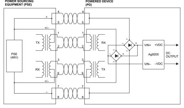 Uproszczoną zasadę działania PoE (Power over Ethernet) pokazuje rysunek 1. Oprócz transmisji danych jednym standardowym przewodem przesyłane jest, także zasilanie. W wersji podstawowej wykorzystane są do tego wolne żyły przewodu – 4, 5, 7, 8, co pozwala na zastosowanie typowych gniazd i transformatorów sprzęgających. W wersji rozszerzonej, do przesyłu zasilania wykorzystane są pary transmisyjne – żyły 1, 2, 3, 6, co wymusza zastosowanie specjalizowanych gniazd zintegrowanych lub transformatorów sprzęgających zdolnych do pracy z większymi prądami uzwojeń.