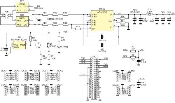 Schemat modułu zasilacza został pokazany na rysunku 2. Złącze PoE dostarcza zasilania z płytki Raspberry Pi3+/4, która wyposażona jest w złącze RJ45 interfejsu Ethernet, z wbudowanym transformatorem separacyjnym przystosowanym do pracy z zasilaniem PoE. Zastosowanie mostków prostowniczych BR1, BR2 zapewnia współpracę nakładki z oboma modelami zasilania. Transil D1 zabezpiecza przetwornicę przed skutkami przepięć w przewodach Ethernet. Dławiki ferrytowe FB1...FB6 ograniczają zakłócenia EMI generowane przez przetwornicę MPoE. Zastosowany moduł zasilacza AG9205-S dostarcza napięcia 5 V. Rezystor RCP służy do określenia klasy PD. Domyślnie jest on nie wlutowany, co informuje PSE o poborze mocy odpowiadającym klasie 0 – 0,44…12,95 W. Jeżeli chcemy ograniczyć zakres mocy, znając charakterystykę własnej aplikacji, należy zmienić jego wartość odpowiednio na 698 Ω dla klasy 1, 383 Ω dla klasy 2 i 249 Ω dla klasy 3, rezystor musi mieć tolerancję maksymalnie 1%.