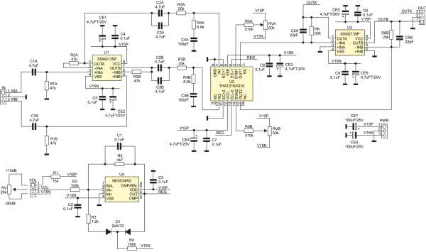 Schemat stereofonicznego modułu regulatora został pokazany na rysunku 2. Elementy pracujące w torze jednego kanału mają oznaczenia z dodatkową literą A, drugiego kanału – z literą B, natomiast elementy wspólne mają oznaczenia bez dodatkowej litery. Sygnał wejściowy z gniazda IN (kanały A i B) doprowadzony jest do bufora U1, wykonanego z użyciem wysokiej klasy wzmacniacza operacyjnego przeznaczonego do torów audio, układu typu SSM2135 od Analog Devices. Wejścia wzmacniacza odseparowane są kondensatorami foliowymi C2, C3.
