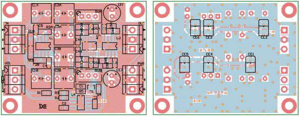 Układ został zmontowany na niewielkiej dwustronnej płytce drukowanej, której schemat, wraz z rozmieszczeniem elementów, pokazuje rysunek 4. Montaż elementów przebiega zgodnie z ogólnymi zasadami i nie wymaga szczegółowego opisu. Gotowy moduł wymaga zewnętrznego niskoszumnego zasilacza o napięciu ±15 V i wydajności ok. 200 mA.