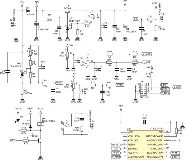 Schemat sterownika ładowarki został pokazany na rysunku 1. Ładowarkę podłącza się do złącza J1, a nadzorowany akumulator do złącza J2. Dioda D1 stanowi ochronę układu przed zniszczeniem w razie niewłaściwej polaryzacji zasilania oraz, co równie istotne, doładowuje kondensator C1. Napięcie z ładowarki, może mieć znaczne tętnienia, dlatego dioda i kondensator realizują skuteczny układ filtrujący.