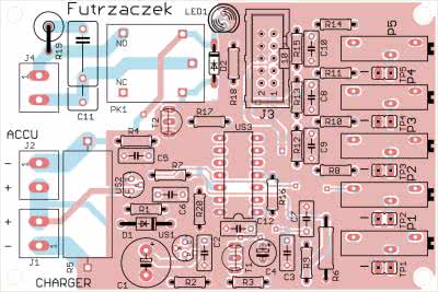 Zadaniem mikrokontrolera jest załączanie przekaźnika PK1, w czym pośredniczy tranzystor T2. Dioda LED1 sygnalizuje swoim świeceniem załączenie ładowarki, a jej zasilanie odbywa się wprost z napięcia akumulatora, aby nie obciążać niepotrzebnie układu stabilizującego napięcie referencyjne. Równolegle do styków przekaźnika został dodany prosty układ gaszący RC, który zmniejsza iskrzenie i emisję zakłóceń elektromagnetycznych, które mogłyby zablokować mikrokontroler.