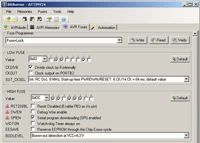 Szczegóły zostały pokazane na rysunku 3, który zawiera zrzut okna konfiguracji tych bitów z programu BitBurner. Spowoduje to załączenie obwodu Brown-Out Detector z progiem czułości około 4,3 V. To uchroni układ przed zawieszaniem się w trakcie włączania.