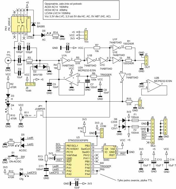 Wyjście J4 (sygnał 1:1) może być wyprowadzone, jak w prototypie, na złącze BNC dostępne z tyłu obudowy, do którego podłącza się oscyloskop. Podgląd sygnału może być bardzo pomocny przy manualnym ustawianiu poziomu wyzwalania lub kontroli automatycznego ustalania poziomu, który ma spore ograniczenia zwłaszcza przy większych częstotliwościach. Sygnały dostępne na J4, J7, J8 są buforowane bramkami układu U3. Podobnie jak w przypadku płytek wzmacniaczy, zastosowano tu bufory wyjściowe z włączonymi równolegle rezystorami, których rezystancję należy dostosować do impedancji przewodów (zwykle będzie to przewód ekranowany 50 Ω).