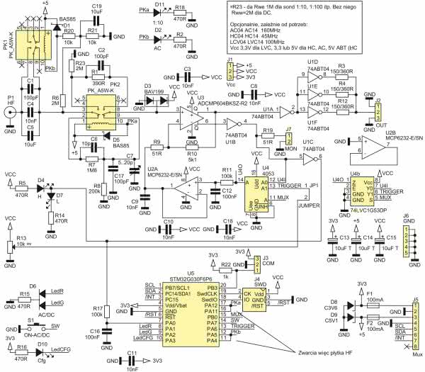 Następną płytką jest wzmacniacz sygnału HF z komparatorem, której schemat został pokazany na rysunku 2. W opisie zostaną pominięte bloki występujące w płytce wzmacniacza sygnału cyfrowego, a omówione będą tylko różnice. Pierwszą z nich jest tłumik 1:10 przyłączany za pomocą styków przekaźnika PK2. W stanie spoczynkowym przekaźnika tłumik jest włączony (R7 i R8). Kompensację częstotliwością zapewnia C6 i C17 wraz z trymerem C7. Gdy przekaźnik jest włączony, tłumik jest odłączony, a sygnał wejściowy jest przekazywany, podobnie jak w przypadku wzmacniacza sygnału cyfrowego, przez szeregowy rezystor R1 i kondensator C2.