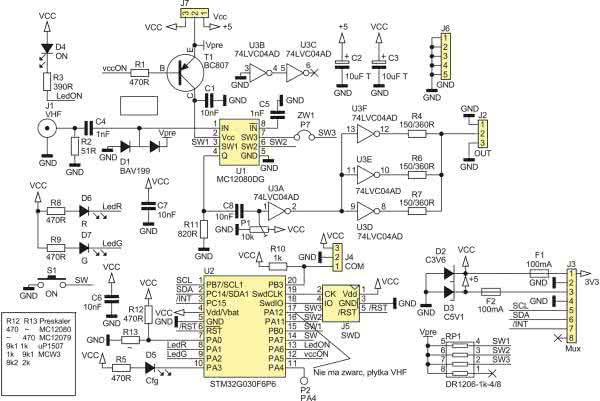 Rezystory drabinki RP1 zapewniają napięcie 5 V w stanie wysokim dla obwodów zasilanych tym napięciem (wyjścia PA0, PB11 i PB12 pracują w trybie otwarty dren). Zworę ZW1 należy założyć, gdy używany jest MC12080, w przypadku μPB1507 musi być bezwzględnie zdjęta, natomiast dla MC12079 nie można znaleźć informacji na temat wyprowadzenia 7 układu, co sugeruje, że zwora Z1 nie ma znaczenia.