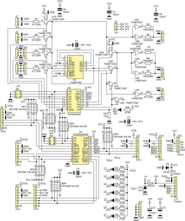 Bramkami układów U1 i U3 steruje ekspander I2C układ U4 typu PCA9554AD. Układ ten jest bardziej zaawansowaną wersją układu PCF8574. Podstawową zaletą PCA9554 w stosunku do PCF8574 jest komunikacja I2C z zegarem 400 kHz, a nie 100 kHz, oraz rejestr kierunku pozwalający na pracę wyjścia w trybie push-pull, a nie pull-up jak na przykład w układach serii 8051, co ogranicza maksymalny prąd wyjściowy w stanie wysokim oraz stromość narastania zboczy sygnału.