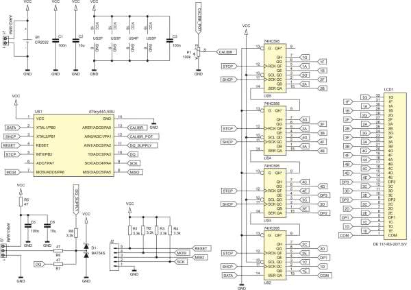 Schemat ideowy energooszczędnego termometru został pokazany na rysunku 1. Jego pracą zarządza popularny mikrokontroler typu ATtiny44A, taktowany wewnętrznym sygnałem zegarowym o częstotliwości 8 MHz. Do jego zaprogramowania może służyć złącze J2, do którego zostały doprowadzone wszystkie linie służące realizacji programowania w systemie (In-System Programming). Ponieważ układ nie używa ich w czasie normalnej pracy, są podciągnięte do dodatniego bieguna zasilania przy użyciu zewnętrznych rezystorów.