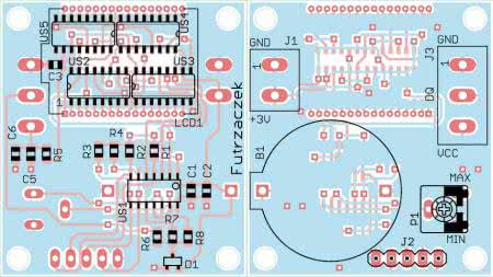 Układ został zmontowany na niewielkiej, dwustronnej płytce drukowanej o wymiarach 45×40 mm. Jej schemat wraz z rozmieszczeniem elementów został pokazany na rysunku 3. W odległości 3 mm od krawędzi płytki znalazły się otwory montażowe, każdy o średnicy 3,2 mm.