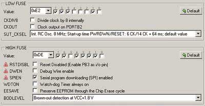 Po zakończeniu montażu, należy ustawić konfigurację bitów zabezpieczających (fuse bits) mikrokontrolera ATtiny44A na następujące wartości:
