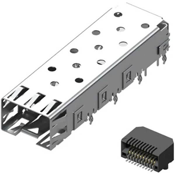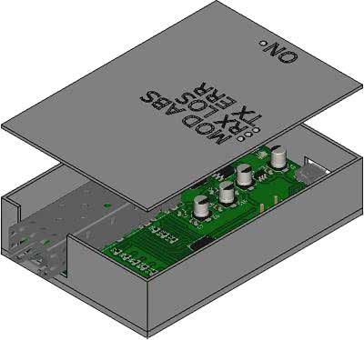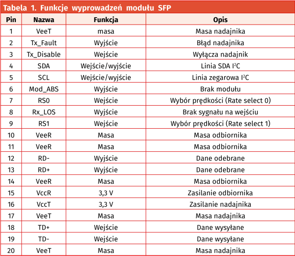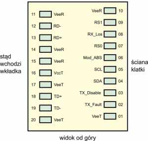 Standard SFP+ jest zdefiniowany w normie [1]. Moduły SFP mają złącze w postaci krawędzi płytki PCB z wyprowadzeniami wykonanymi, jako 20 metalizowanych pół po obu stronach płytki. Jednak do jego połączenia z płytką używa się odpowiedniego gniazda oraz metalowej „klatki”, które zostały pokazane na fotografii 3.