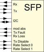 - Tx_disable – wejście pozwalające na sterowanie diodą laserową w nadajniku. Gdy panuje na nim stan wysoki jest ona wyłączona. Wejście to powinno być wewnątrz modułu podciągnięte do plusa zasilania za pomocą rezystora. Aby włączyć nadajnik należy wymusić na nim stan niski;