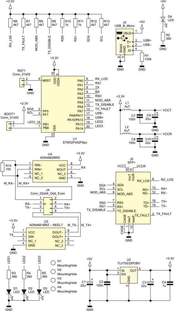 Złącze mikroUSB J2 służy do komunikacji oraz zasilania. Dioda D4 sygnalizuje obecność napięcia. Stabilizator U2 dostarcza napięcia 3,3 V dla mikrokontrolera oraz modułu SFP. Dodatkowo zasilanie sekcji nadajnika i odbiornika jest filtrowane przez cewki L1, L2 oraz kondensatory C7...C10. Złącze J5 umożliwia dołączenie modułu SFP.