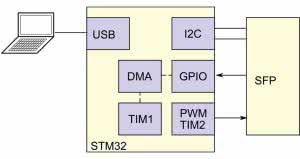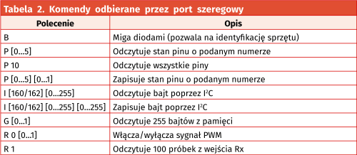 Listę obsługiwanych poleceń znajdziemy w tabeli 2. Polecenie B powoduje miganie diodami modułu. Jest ono przydatne do identyfikacji urządzenia, gdy podłączonych jest kilka modułów, na przykład przy eksperymentowaniu z komunikacją pomiędzy dwoma SFP. Komendy P pozwalają na obsługę wejść/wyjść konfiguracyjnych modułu. Rozkazy I i G służą do dostępu do pamięci I2C. I pozwala na odczyt/zapis pojedynczego adresu, natomiast G odczytuje całą stronę z pamięci. Ostatnia rodzina poleceń to R. Pozwalają one na zgrubne testowanie komunikacji. Możemy włączyć generowanie sygnału PWM na lini nadawczej. Drugi rozkaz uaktywnia moduł DMA, który zbiera do pamięci sto kolejnych próbek z wyjścia Tx. Pozwala to na proste eksperymenty z torem nadawczo/odbiorczym.