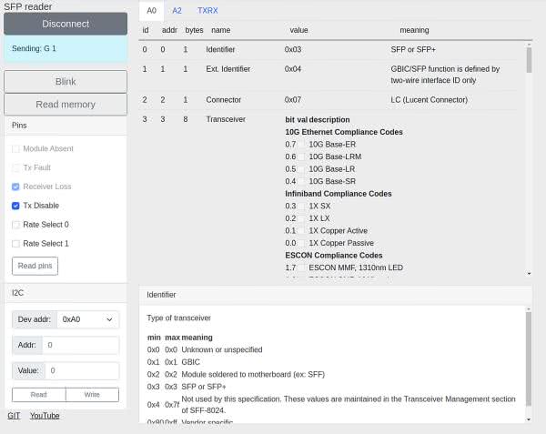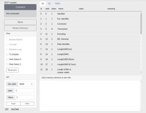 Poniżej znajdziemy przyciski: Blink miga diodami, a Read memory wczytuje całą zawartość pamięci. Poniżej w panelu Pins znajdują się kontrolki pokazujące stan i pozwalające sterować wejściami i wyjściami modułu SFP. Aby uaktualnić stan klikamy przycisk Read pins. Ostatni panel I2C pozwala na odczyt i zapis pojedynczego rejestru pamięci.