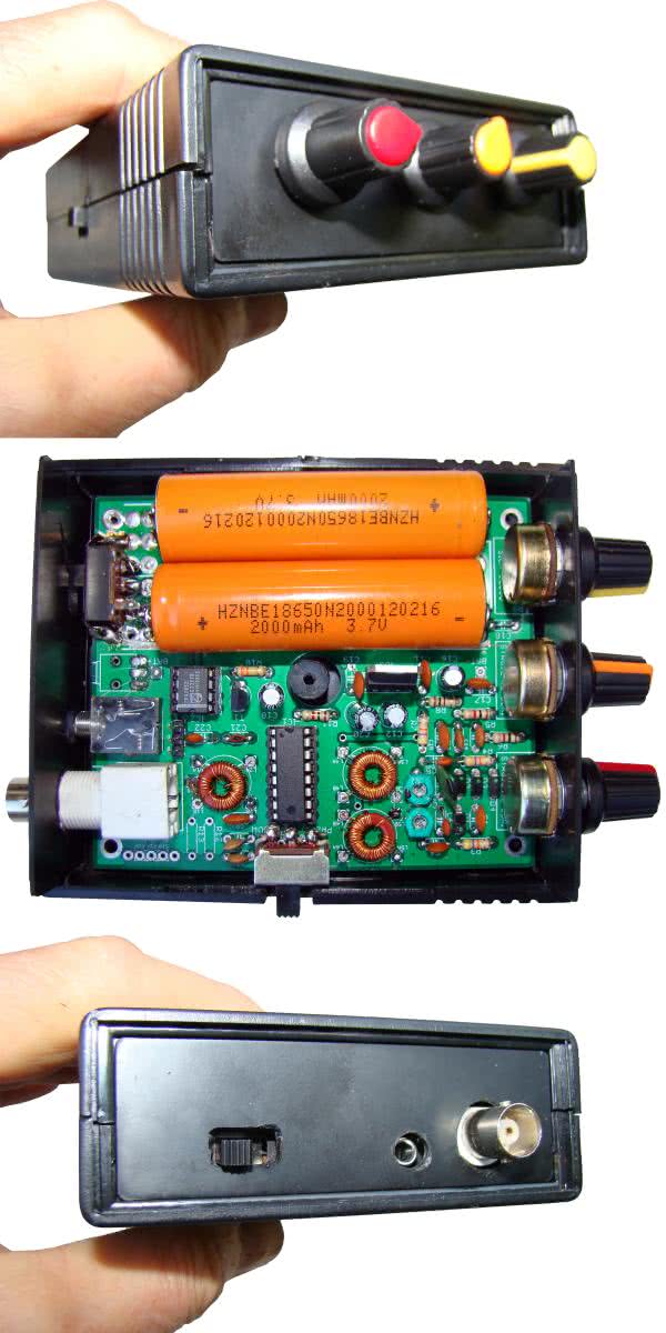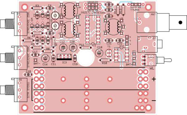 Opcjonalnie można zainstalować z boku także tłumik w postaci potrójnego przełącznika suwakowego np. SUW3P2-3. Zamiast przełącznika, z zerem pośrodku (ON-OFF-ON) i dwoma rezystorami, można użyć na wejściu antenowym potencjometru np. 1 kΩ/B i wejście sygnału RX-a pobierać z suwaka (problemem może okazać się znalezienie miejsca w obudowie na zamontowanie potencjometru).