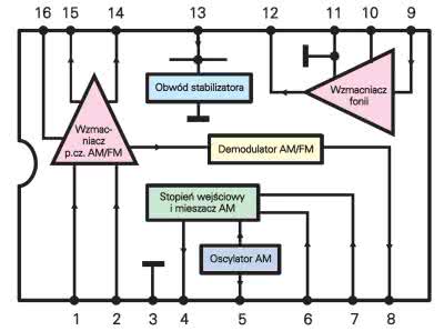 Kluczowym elementem opisywanego tu prostego odbiornika o bezpośredniej przemianie został nieco starszy układ scalony, ale wciąż dostępny w sieci handlowej – TDA1083 (TA7613AP, A223D, 174XA10). Jest to kompletny radioodbiornik AM/FM ze wzmacniaczem fonii (z wyjątkiem stopnia wejściowego FM). Schemat struktury wewnętrznej układu scalonego został pokazany na rysunku 1.
