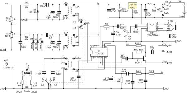 Kompletny schemat prostego dwupasmowego odbiornika na pasma 80/40 m z zastosowaniem układu scalonego TDA1083 został pokazany na rysunku 2.